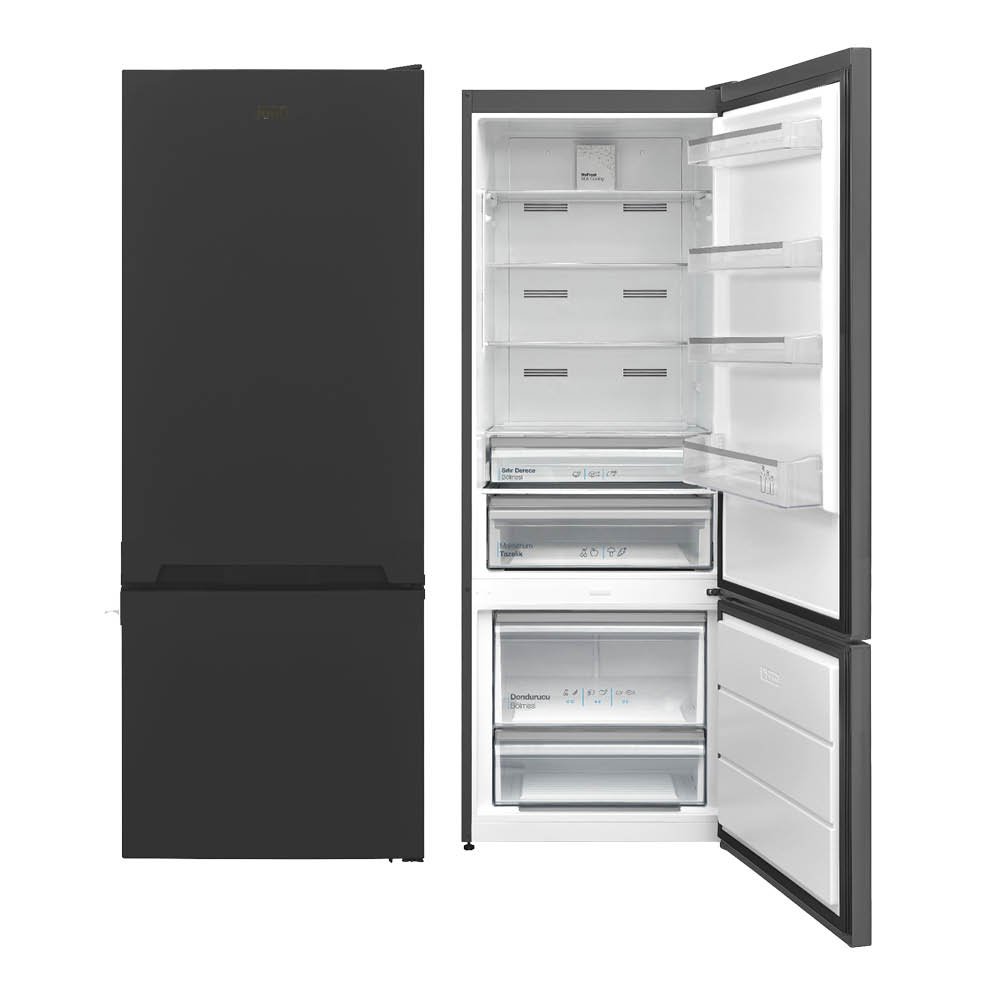 The Juno refrigerator with a capacity of 357 liters in a tall black finish, offers full NO FROST cooling to maintain a uniform temperature and prevent ice buildup. This model includes high-quality glass shelves that allow for convenient arrangement of products, and ultra-quiet operation suitable for everyday use in a home environment. The internal structure is spacious and allows for convenient storage, and its black exterior gives the kitchen a modern and elegant look.
